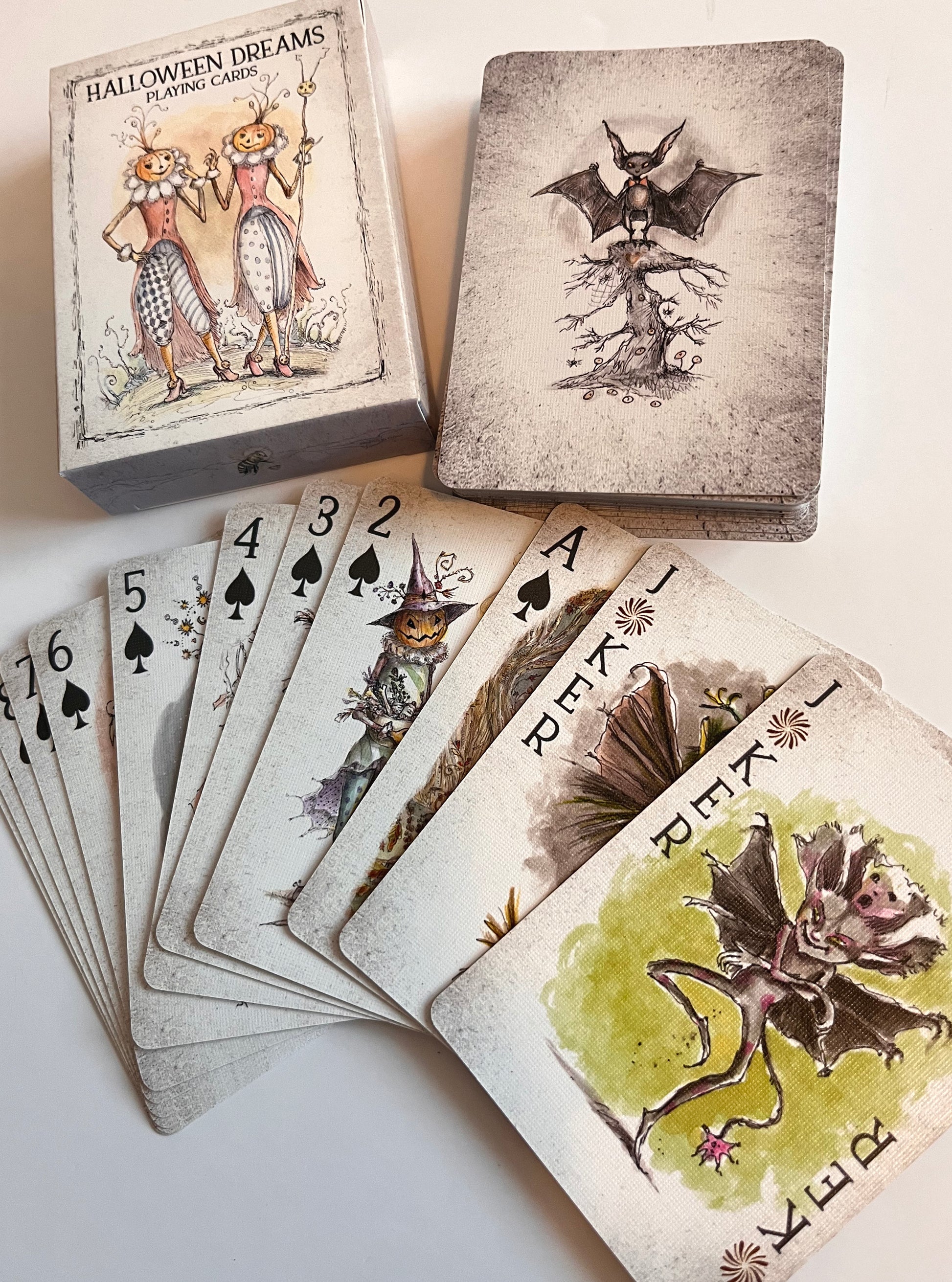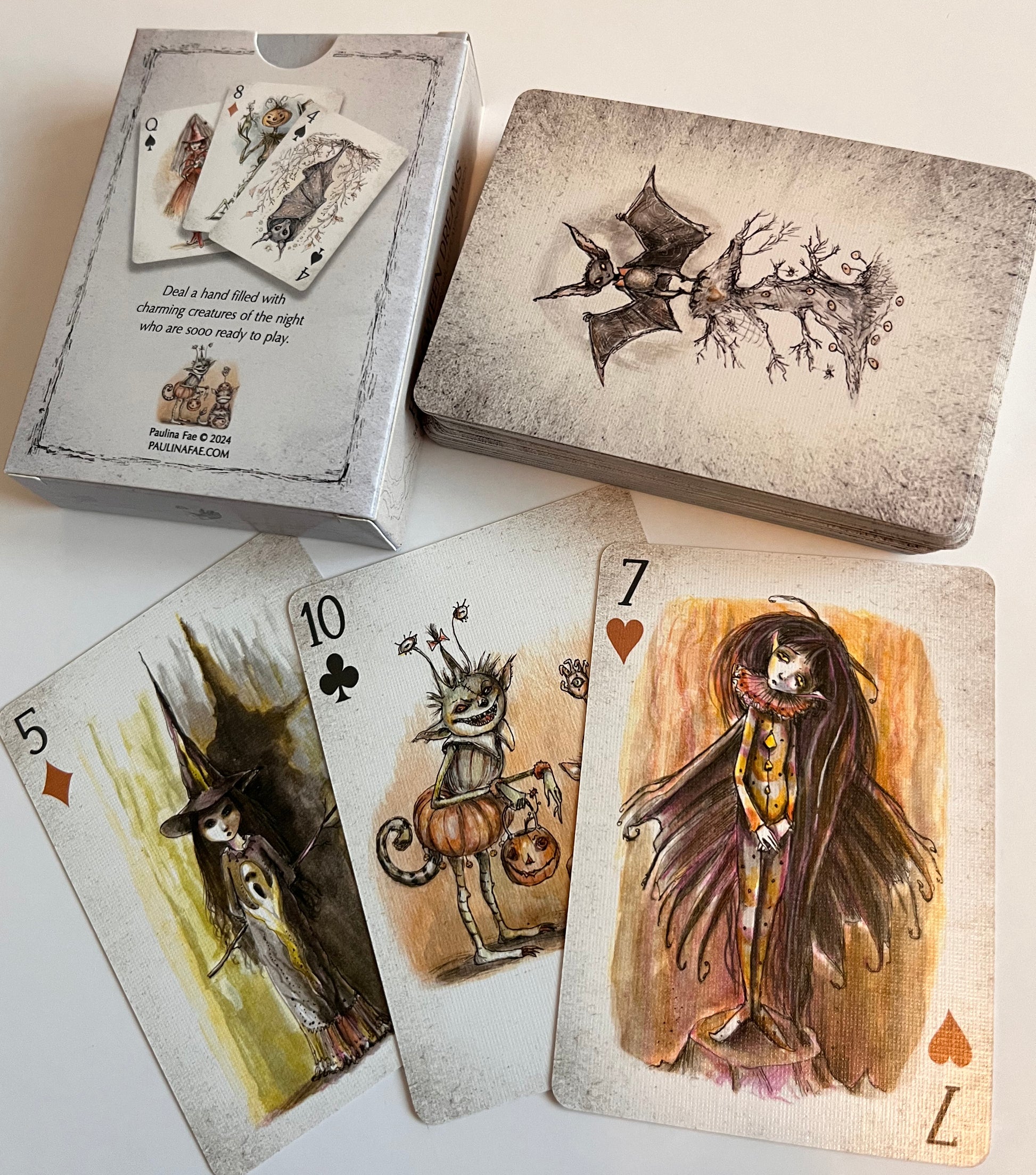 Jump into a fun-filled adventure with friends with this fully-illustrated set of limited-edition playing cards. Meet a delightful assembly of creatures such as pumpkin peeps, sultry witches, mischievous faeries, haute couture bats, lively ghouls, and other beings eagerly awaiting the company of fellow Halloween enthusiasts.
